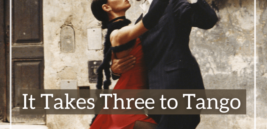 Three? Isn’t the correct saying, “It takes two to tango?” The popular idiom, “It takes two to tango,” refers to the understanding that a tango dance, much like a relationship, requires two people, not just one, to keep it moving and to produce an outcome (good or bad). The two dancers are intertwined at the hip, rarely separating from each other’s embrace. Where one goes, the other goes, and so on.